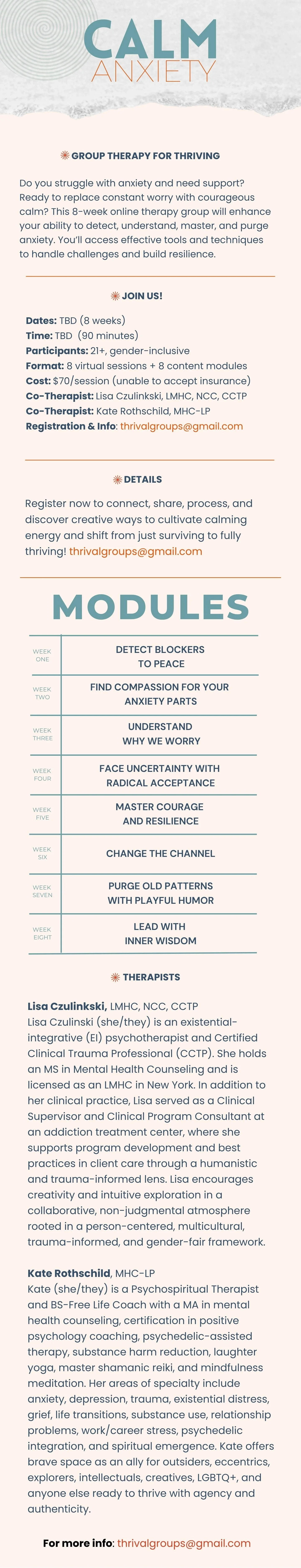 The group is facilitated by therapists Lisa Czulinski (LMHC,NCC,CCTP) and Kate Rothschild (MHC-LP) who are experienced supporting clients on their courageous healing journey from anxious distress to confident calm. We are committed to offering a brave, inclusive space for sharing, supportive connection, and self-development.
